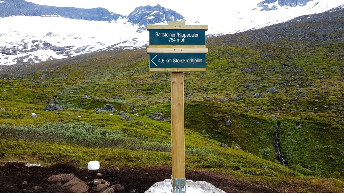 The path follows Åningselva (river) for quite a long stretch before turning right across the pass between Storskredfjellet and Brekkefjellet. The pass lies at about 1,040 metres above sea level.