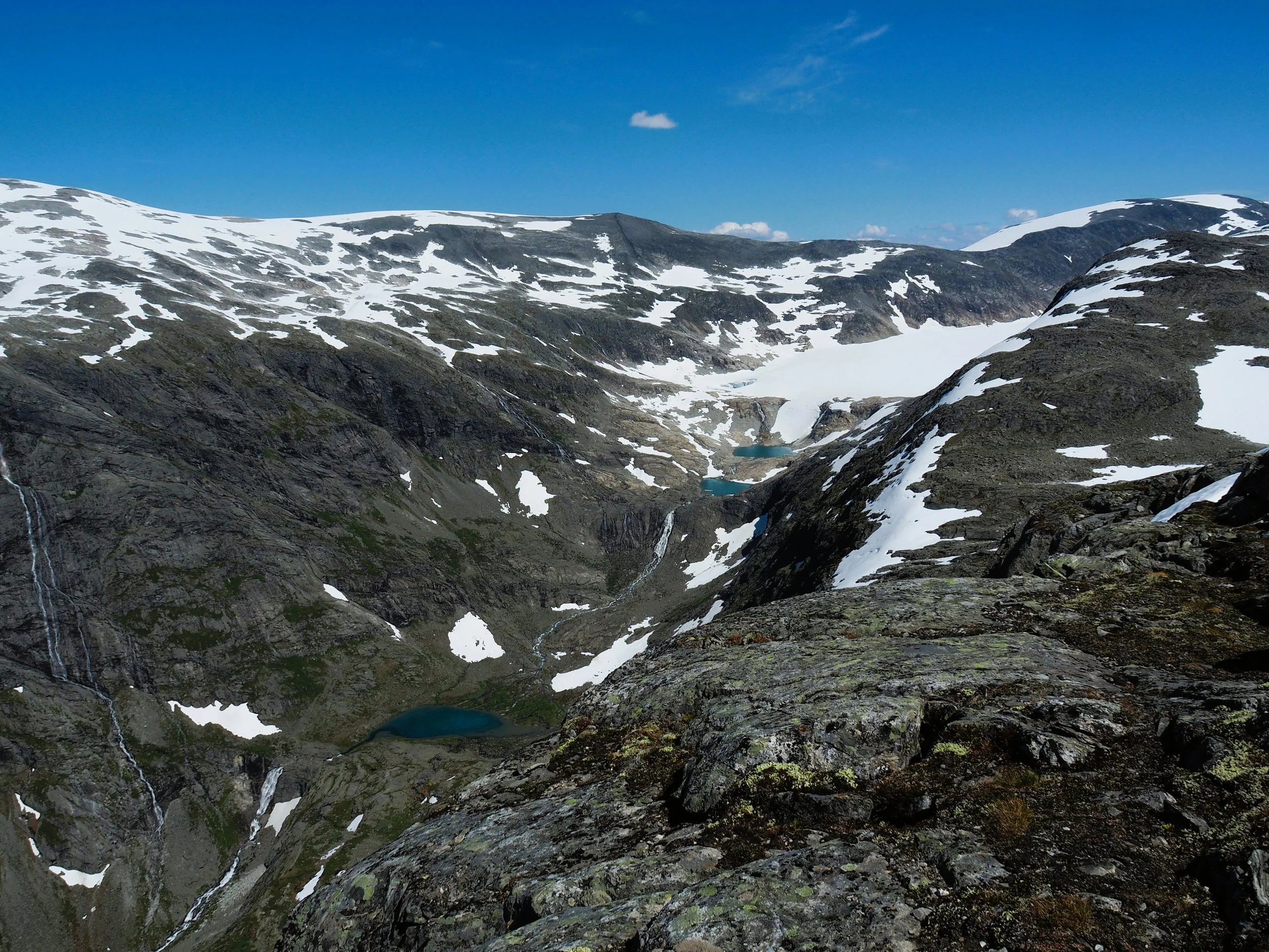 Here you see the mountains on the south side of Strynekåpa. Closest is Teinosa (1578 masl.). Behind it lies Teibreen (glacier). At the far center of the picture is Lodalskåpa (2083 masl.). To the right of Lodalskåpa is a sharp peak, Veslekåpa (1988 masl.), and to the left, just above the glacier, is Brenibba (2018 masl.). On the far left of the picture is Tverrfjellet (1888 masl.).