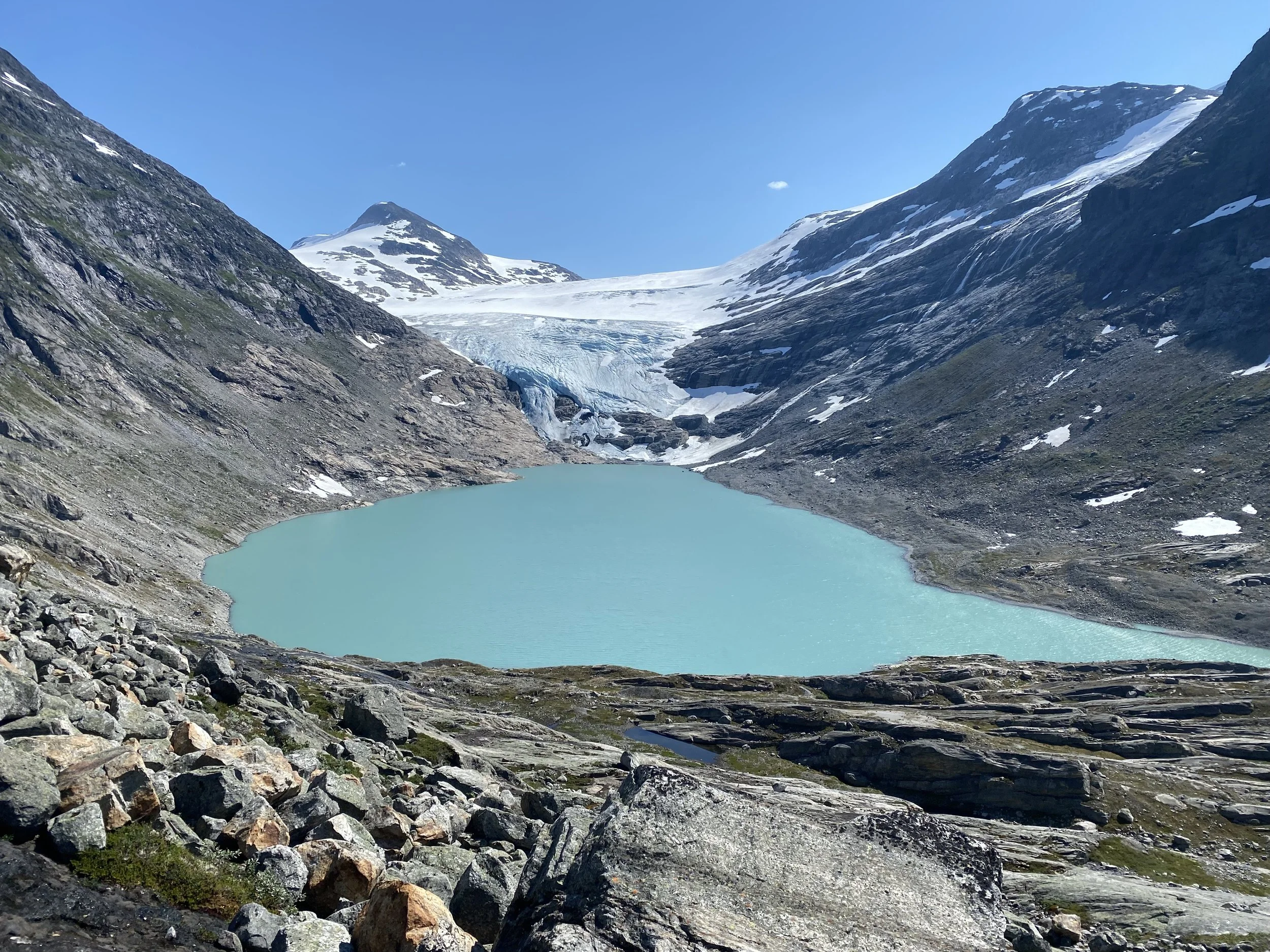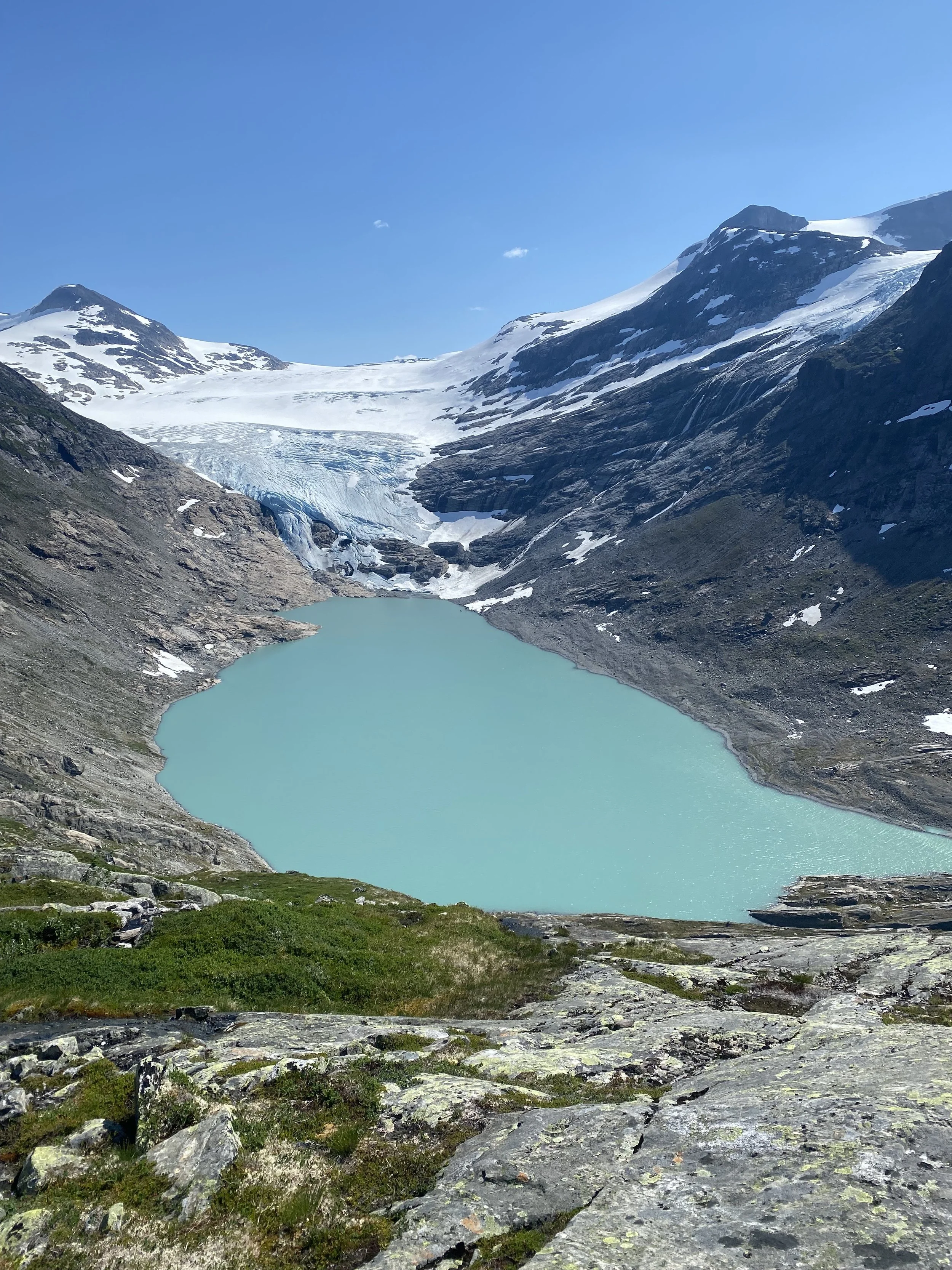 View towards the green glacier lake and Erdalsbreen glacier. The green color comes from the fine rock dust that the glacier grinds off the mountain.