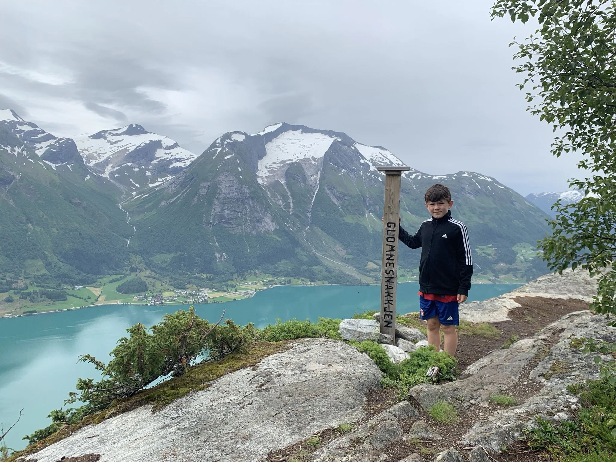 Glomnesnakken (650 moh.). I bakgrunnen ser vi Skåla (1848 moh.) og Storskredfjellet med breen i midten (1815 moh.)