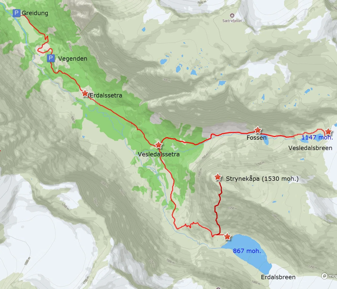 Fremst i Storedalen ligg Erdalsbreen. Det ligg i dag eit stort brevatn framfor breen. Frå brevatnet kan du gå vidare mot Strynekåpa. Frå toppen får du eit flott utsyn mot Erdalen og Lodalskåpa.