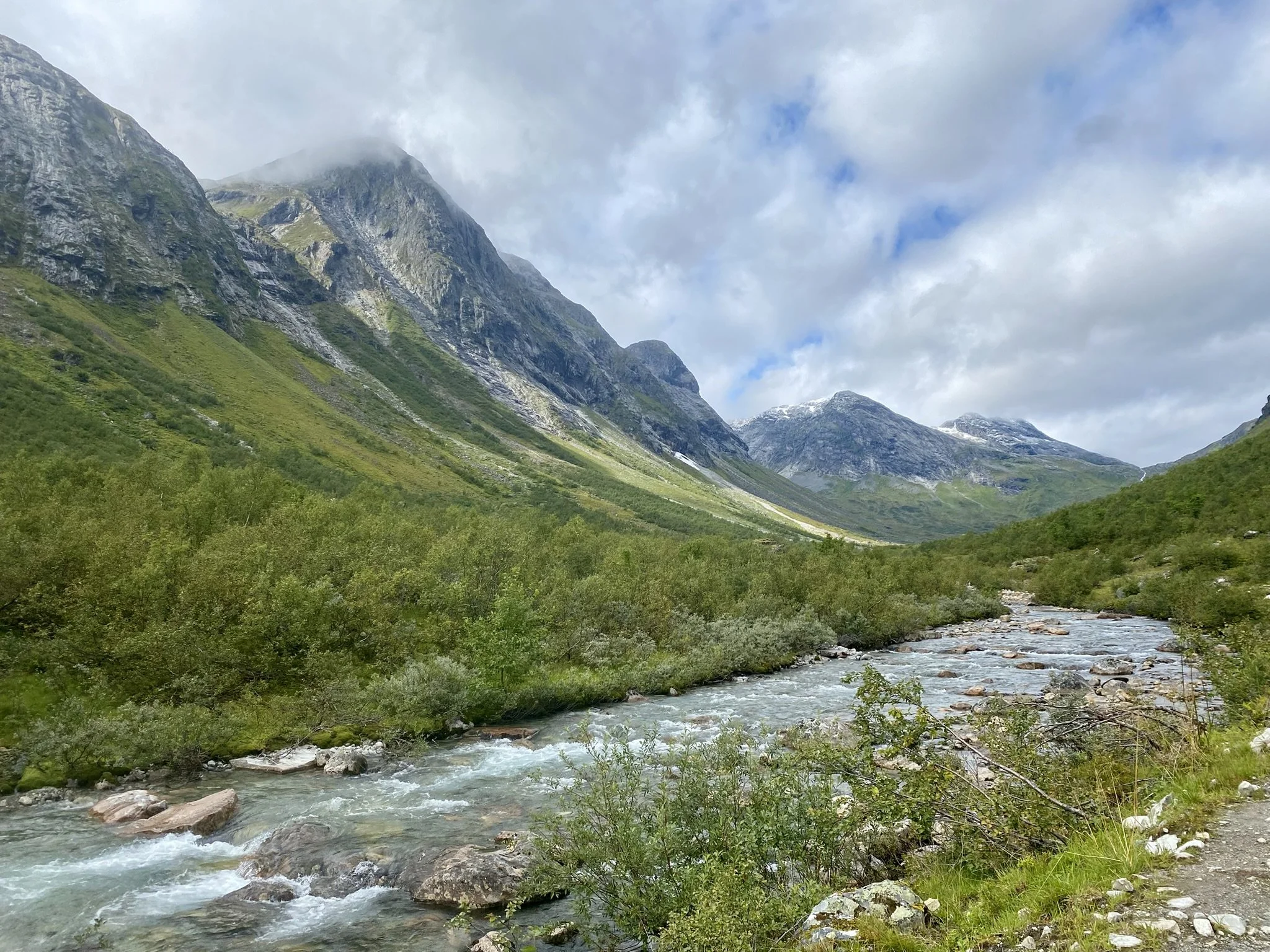 Råsa mot Skjerdingsdalsbotnen går langs elva lange stykke. På bildet over ser vi Flydalsreset bakarst i dalen i den høgre bildekanten. Bak i dalen mot venstre kan vi sjå Tverrbotnen som fører opp til Nautebreen.