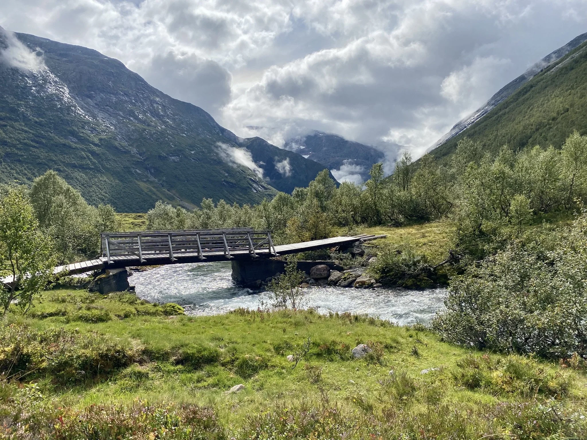 Vi ser den vesle brua over Tverrelva. Tverrelva kjem ned frå Setreskaret, og ho kan i periodar gå ganske stor.